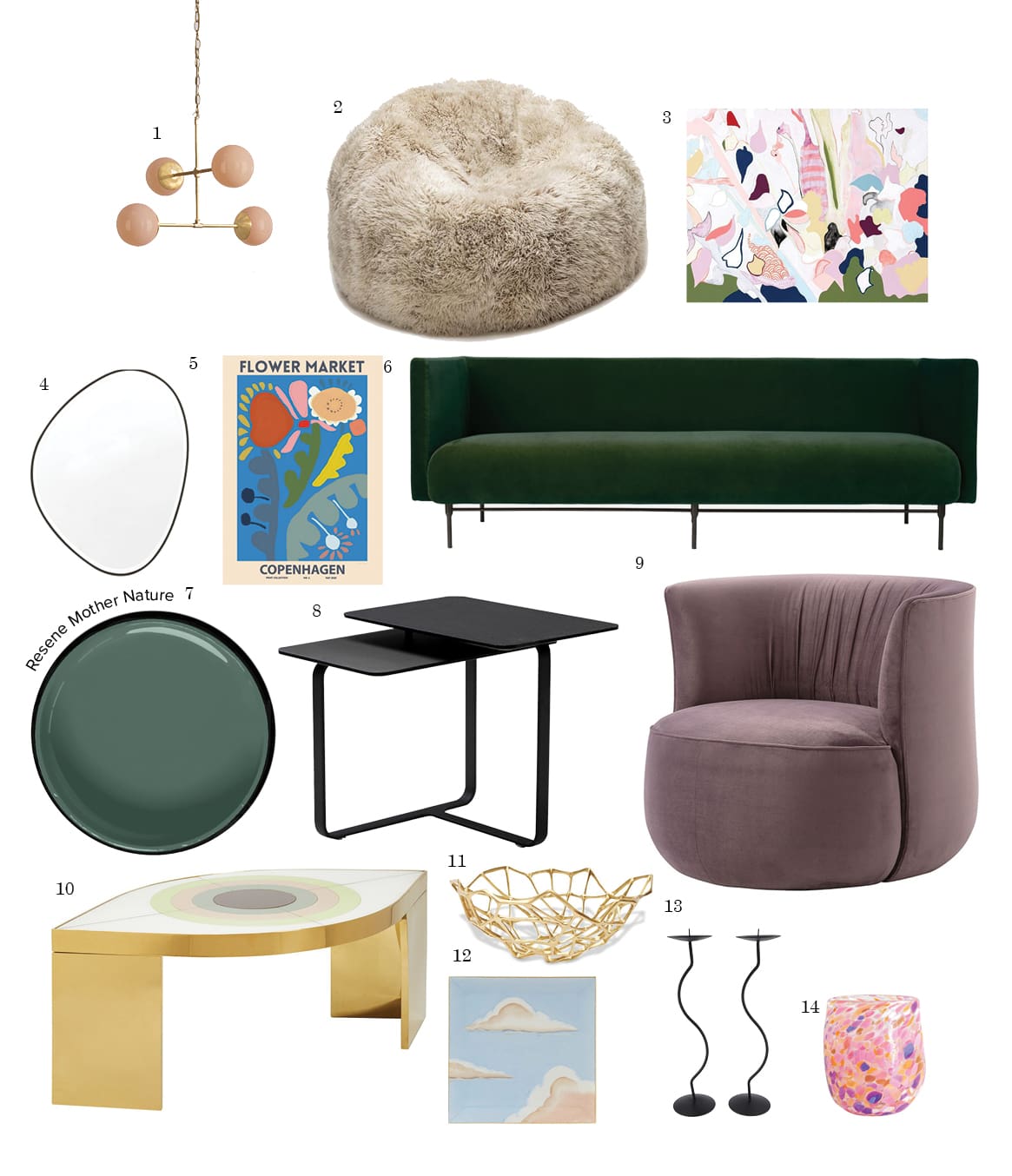 1. Pendant $2990 from Douglas & Bec 2. Beanbag $1690 from Thread Design 3. Print by Beth Kennedy, $790 from Good Thing 4. Mirror by Middle of Nowhere, $399 from Shut the Front Door 5. Print by Astrid Wilson, $119 from Ruby 6. Sofa by Warm Nordic, $6550 from Good Form 7. Resene Mother Nature, $4.80 from Resene ColorShops 8. Side table by Wendelbro, POA from Dawson & Co 9. Armchair $1795 from Contempa 10. Cocktail table by Jonathan Adler, $4755 from Smith & Caughey’s 11. Bowl by Tom Dixon, POA from ECC 12. Tray by Jonathan Hansen X Marie Daâge, $690 from matchesfashion.com 13. Candleholders by Fourth St., $350 from Simon James 14. Tumbler by Keith Grinter, $50 from Crushes