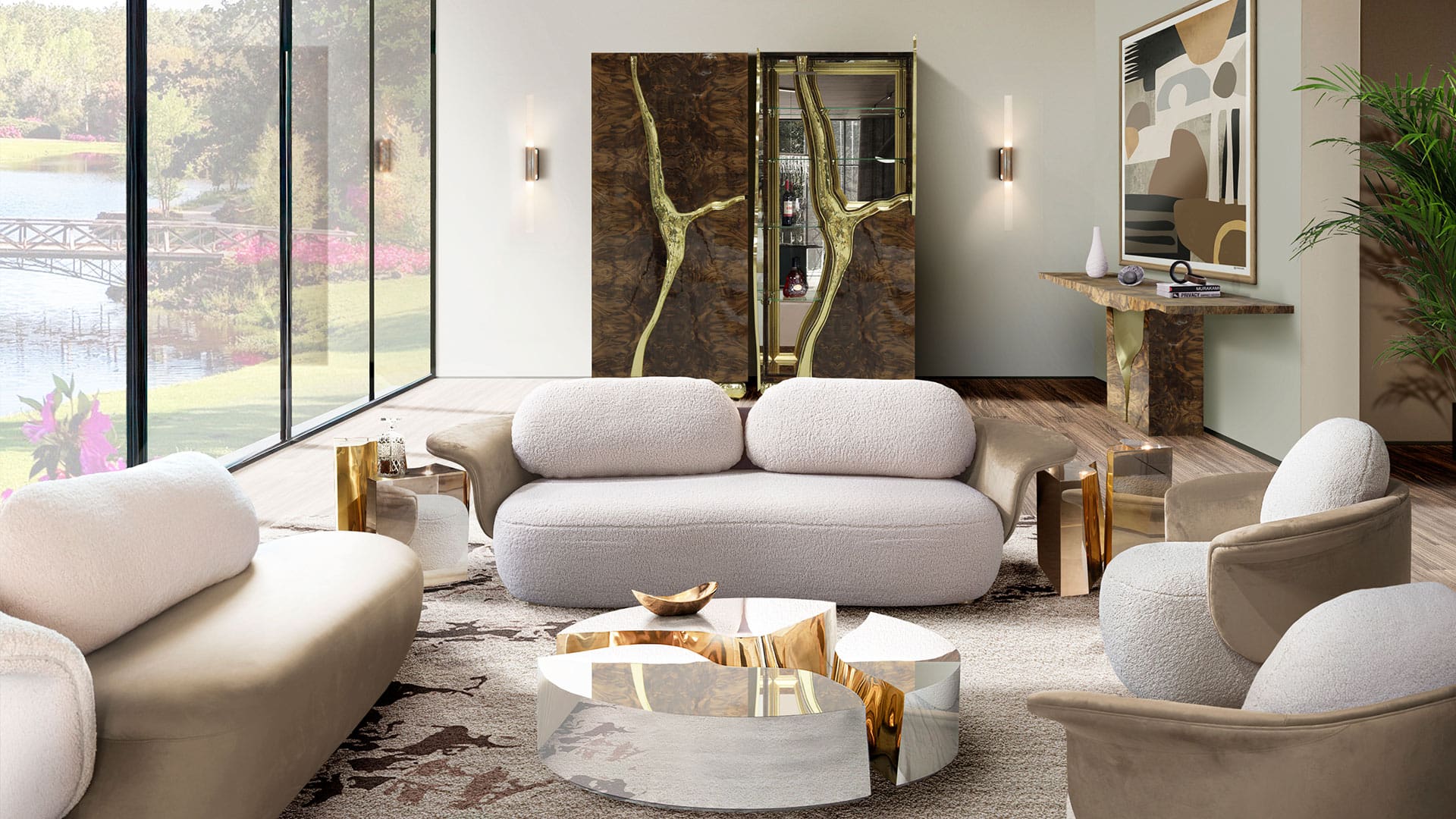 Pantone Color of the Year 2025 | Spring/Summer decor in mocha mousse and gold tones with Lewis two seat sofa, marble center table, neutral rug, and walnut wood cabinet
