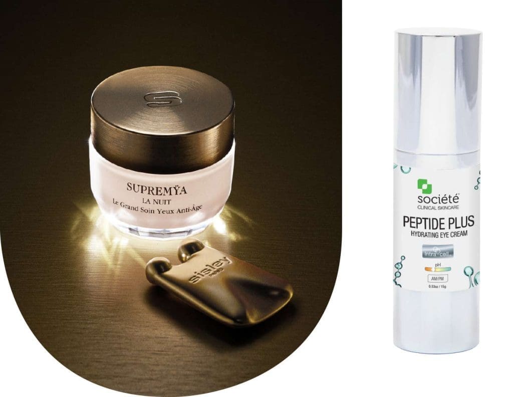 Paired with an intuitive zamac massager, Sisley Supremÿa La Nuit The Supreme Anti-Age Eye Cream, $570, works to instantly refresh the eyes to relieve the stress of the day. The retinol-infused Société Peptide Plus Eye Cream, $154, targets aging signs for firmer, plumper skin.