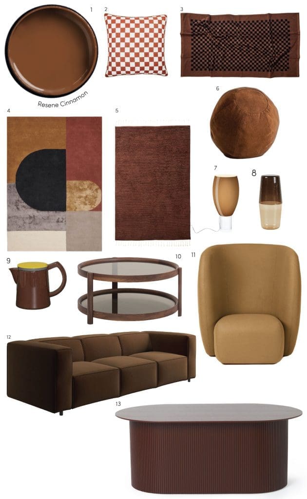 1. Resene Cinnamon, $4.90 from Resene ColorShops | 2. Cushion from Bonnie and Neil, $249 from Father Rabbit | 3. Towel, $110 by Baina | 4. Rug, $1295 from Stacks | 5. Rug by Armadillo, $3090 from The Ivy House | 6. Cushion cover, $138 from Klay | 7. Lamp by Foscarini, POA from Ecc | 8. Carafe and glass set by R+D.LAB, $275 from Tessuti | 9. Coffee pot by HAY, $295 from Everyday needs | 10. Coffee table, 1890 from Città | 11. Armchair by Warm Nordic, $5495 from Good Form | 12. Sofa, $6769 from Bo Concept | 13. Table by Ferm Living, $1910 from Slow Store