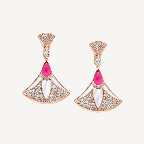 The necklace and earrings take inspiration from the 20’s with their famed floral patterns and the timeless elegance of floral motifs from Ancient Egypt, Greece and the Roman Empire. Made to suit any occasion, the necklace offers two different lengths and wearability – one embracing the neck and the longest version gently dropping over the neckline – as an element of its chain can be detached and worn separately as a delicate bracelet. Bulgari has embellished the feminine fan-shaped pendant with mother-of-pearl petals, set against a backdrop of brilliant pavé diamonds.