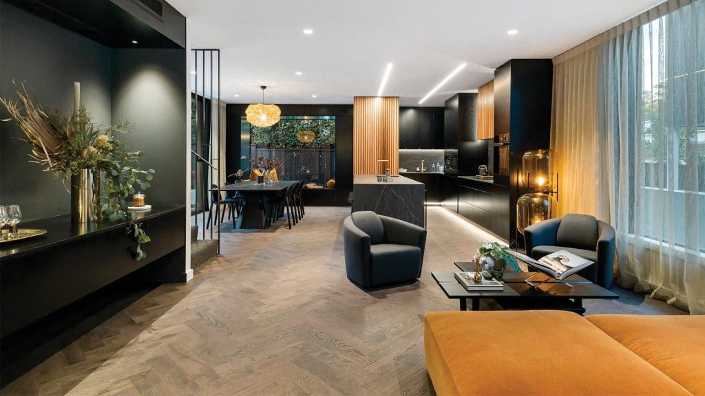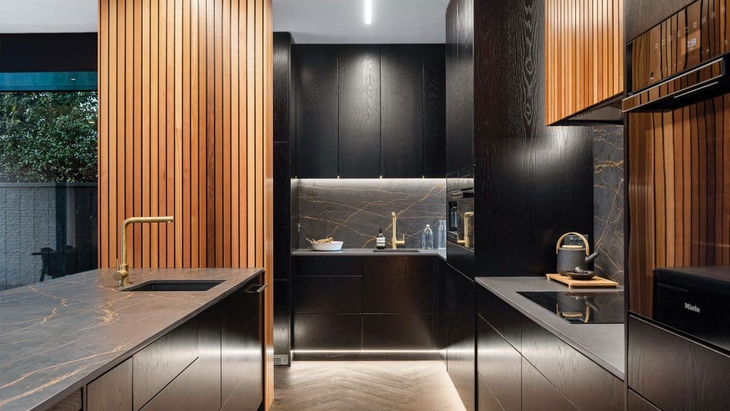 The ground floor features an expansive open-plan living area with casual entertaining spaces and a media room or second living space. The meticulously designed kitchen is all about entertaining and cooking up a storm in absolute style with a showcase of jet-black timber veneer throughout, lending the space a warm, luxurious ambiance. This is finished with top-of-the-line Miele appliances and thoughtful details such as an integrated fridge and the requisite coffee machine housed in a slick, dark minimalist design. Ebony tiling and benchtops featuring black marble texturing with golden streaks elevate the sophisticated feel of the space while complementing the vertical cedar features, which counter the darker tones perfectly.