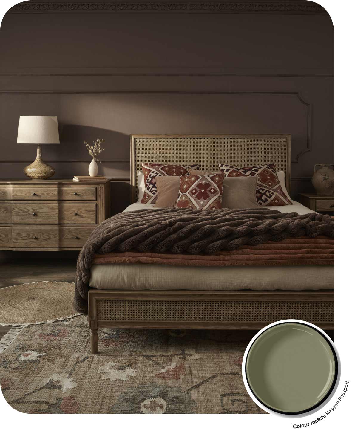 The Love Story Srnit Rattan Bed from French Bedroom sits comfortably in this mindset. The woven cane panels and soft timber frame give it presence without bulk. Paired with terracotta and rust-toned textiles, the look is layered but not busy.