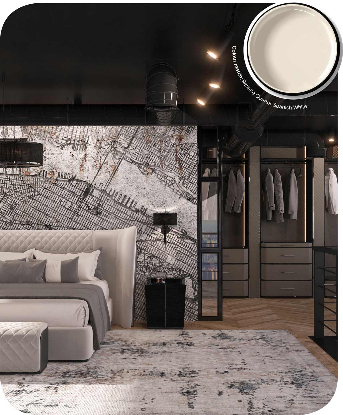 Industrial doesn’t have to mean cold, and minimal doesn’t have to mean bare. This bedroom shows how urban edge and high design can work together without losing comfort. Polished materials and sharp lines sit alongside plush textures and soft finishes, creating a space that feels intentional but not clinical.