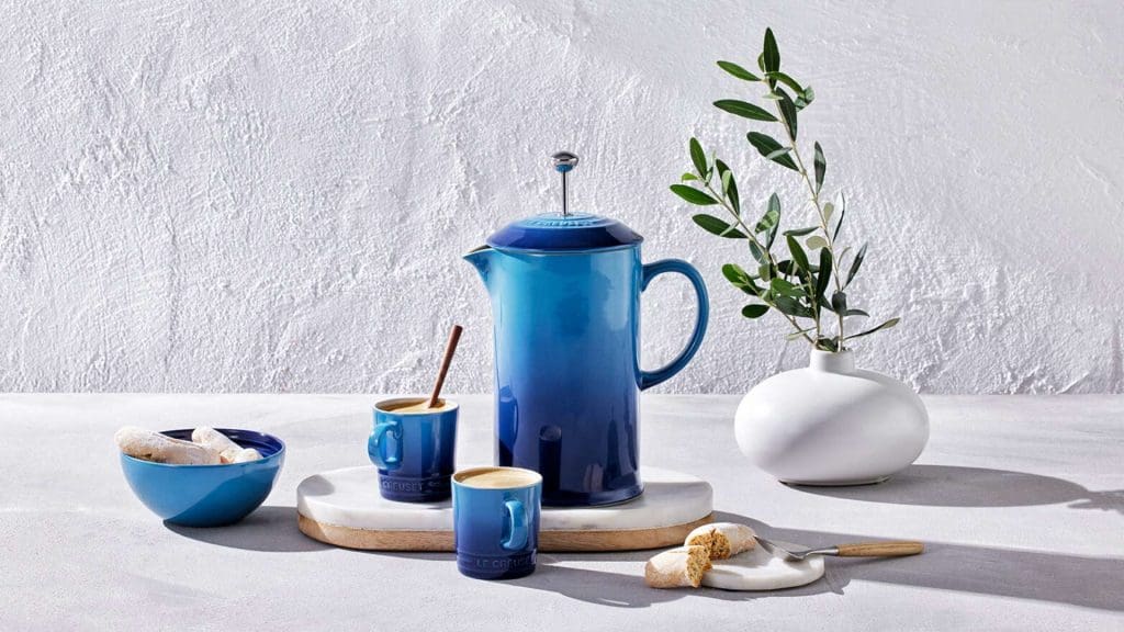 Wow guests or enjoy your morning properly with the Le Creuset Coffee Pres. whether your entertaining or snuggling up at home alone this beautiful piece of stoneware is the best way to get your caffeine fix. Le Creuset never cuts corners and their latest coffee press in a stunning azure blue is no exception. It makes a fine piece to be added to anyone’s existing or burgeoning Le Creuset collection. It has a generous 1 litre capacity and comes with a distinctive three-ring design which brings it in line with Le Creuset’s cast iron pots. Made of premium specialist clays and glazing it maintains an even temperature and is incredibly strong and durable. If azure blue clashes with your decor, no problem, it comes in a range of equally stunning colours.