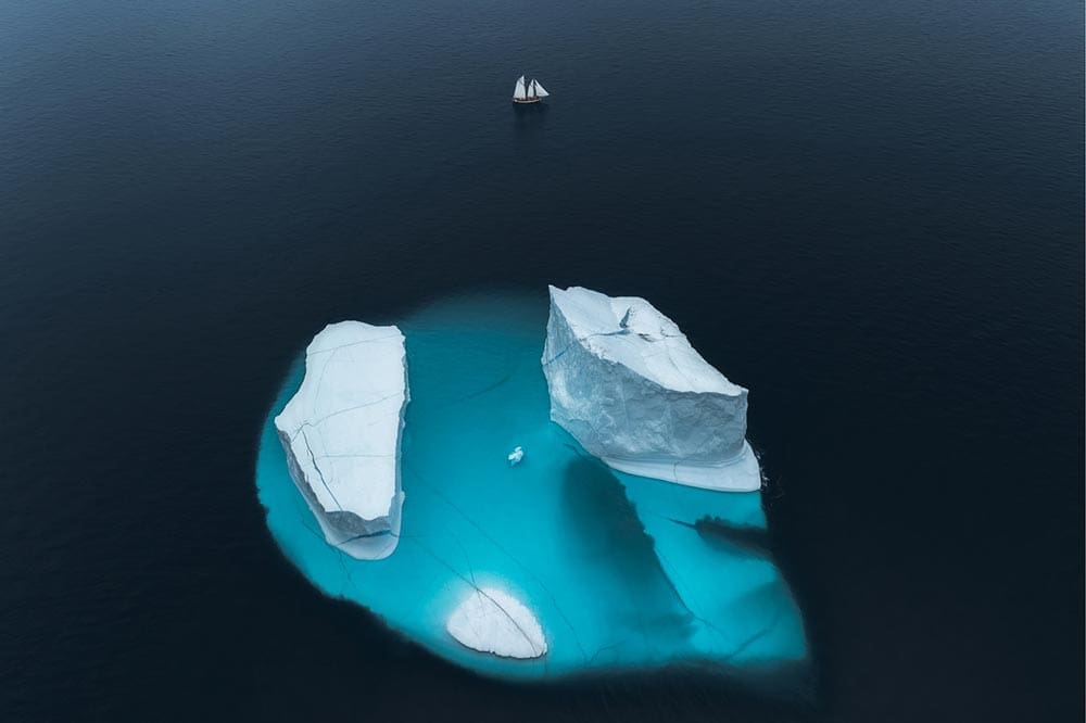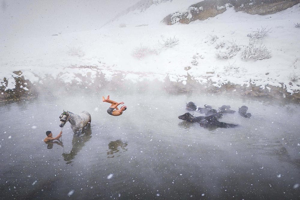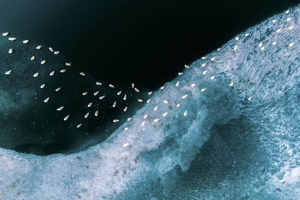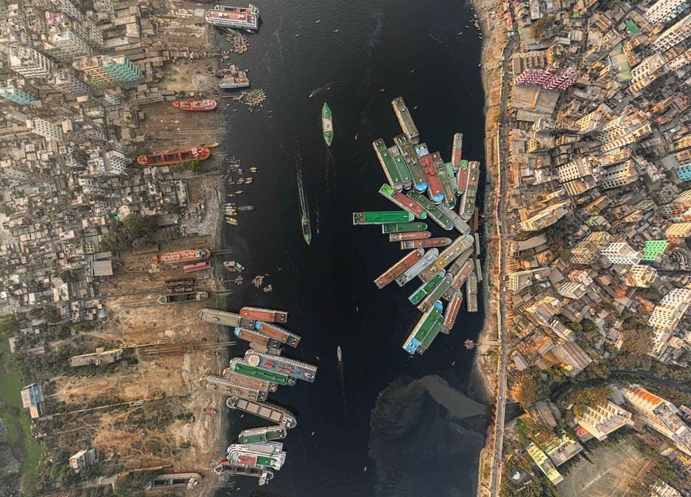 Swallowed The Artemia pleasure boat stands marooned in the dried bed of Lake Urmia, Iran—trapped in a crater eerily shaped like a monster’s belly. Years of drought, mismanagement, and agricultural overuse have drained the lake, leaving behind symbols of its forgotten past. Lake Urmia (Iran), Mohammad Ataei MohammadiFog Sea Tower Shadow Captured by a DJI drone near Tianjin West Railway Station in China, this work combines three images, achieving visual impact and completeness. It was taken during heavy fog, which adds a sense of technology to the central building. The perspective shifts from the expansive surroundings to the architectural details. Tianjin (China), Zhèn Wěi LǐGolden Gate Park During a flight over San Francisco, this symmetrical division between Golden Gate Park and Outer Sunset neighbourhood, separated by Lincoln Way, was captured during golden hour. The photo was taken from the open window of a small plane. San Francisco (USA), Alex VisbalDhaka City, an urban panorama This is a panoramic photograph of the Buriganga River, which runs through Dhaka. The polluted waters of this busy river are visible, along with the chaotic and overcrowded construction on each bank. An impressive city that never rests, filled with deafening noise. Dhaka (Bangladesh), Fran ArnauEdge of Stillness From above, a quiet flock of ducks marks the fragile boundary between frozen silence and open water. Shot in the heart of winter, this image captures nature’s elegant geometry—where life arranges itself instinctively along the shifting edge of ice. Nyékládháza (Hungary), Helga UrbánThe Lone Horseman During the magic of blue hour, a lone rider stands atop a rocky outcropping in the heart of Cappadocia. Taken on the very first evening during Dennis’s winter trip, this photo showcases the beauty and mystery of Cappadocia in all its glory. Using his drone, Dennis managed to find a unique and breathtaking perspective that had never been captured before in this often-photographed landscape. Cappadocia (Turkey), Dennis SchmelzScale An aerial view of two massive icebergs floating in deep blue Arctic waters deep within Greenland’s massive fjords, with their submerged portions glowing turquoise beneath the surface. A small sailboat in the distance adds scale and serenity to this striking polar seascape. Greenland, Thorarinn JonssonTumble In the Güroymak district of Bitlis, villagers take their animals to nearby hot springs to increase their milk yield and clean them, regardless of the winter conditions, and while they ensure their animals are happy in the 40°C water, they also enjoy the moment. Bitlis (Turkey), İbrahim ŞİmŞekInto the abyss This photo was taken during an elopement photoshoot. An amazing location was found: a bridge over a large ravine in an ancient Italian town. The dark and gloomy sky, combined with the picturesque ruins in the background, created the perfect setting for this cinematic image. Gravina in Puglia, Apulia (Italy), Tim DemskiSheep Herding, Switzerland Sheep returning from summer pasture in the Aletsch Glacier are herded down a footpath that was blasted out of a sheer canyon wall after the glacier retreated in the mid-20th century. Prior to that, they could access the high summer pasture by walking across the ice that once filled the canyon. Valais (Switzerland), George SteinmetzRunning on Salt Runners push forward as the first light of dawn breaks over the Dead Sea. The photo was captured during the Dead Sea Marathon, and this moment reflects both human endurance and the surreal beauty of the lowest place on Earth. The Dead Sea, Shimon PerlsteinAnother World This is a top-down drone capture of a fever of cownose rays dividing a school of menhaden fish. Taken just off the coast of Southampton in August, the sky was clear and the sea was calm, allowing the sunlight to enhance the waters’ depth and the bursting sand clouds. Southampton, New York (USA), Joanna SteidleEthereal Encounter Flying the drone along the remote North West coastline, Matt spotted the spectral shape of a critically endangered Green Sawfish emerge from the cloudy water and swim through a group of sea turtles, before disappearing back into the depths of the tidal lagoon. Western Australia, Matt DeakinIce Fishing Fishermen on Lake Beyşehir, which freezes in winter, continue their work by breaking the ice with their own tools and opening a path in the lake. Although this job is difficult, they adapt to all conditions as fishing is their livelihood. Lake Beyşehir, Konya (Turkey), Esengül Alıcı Biber