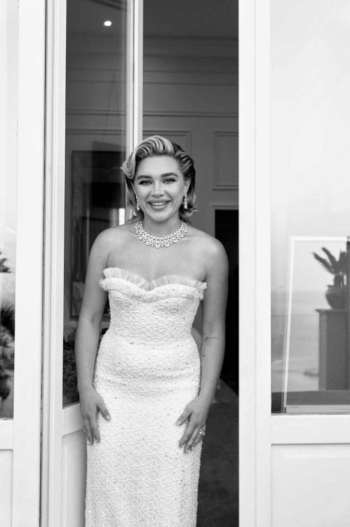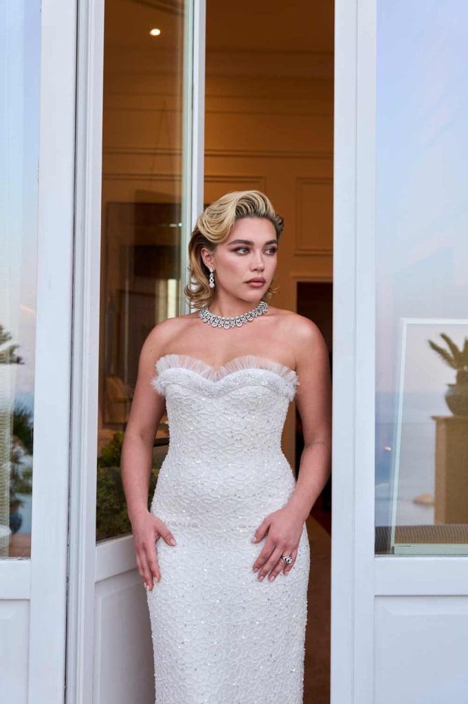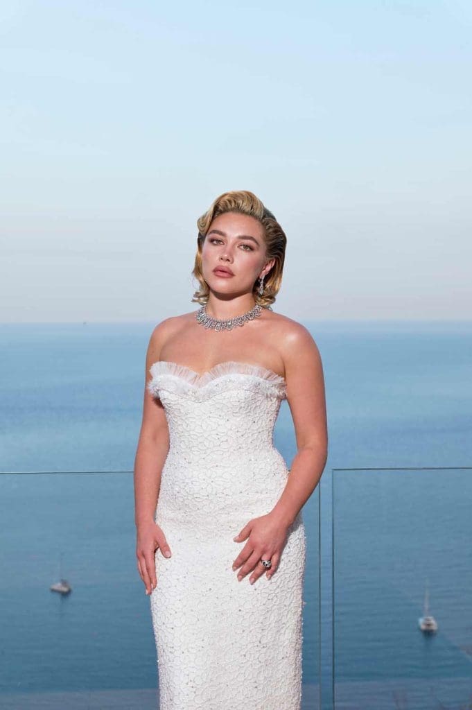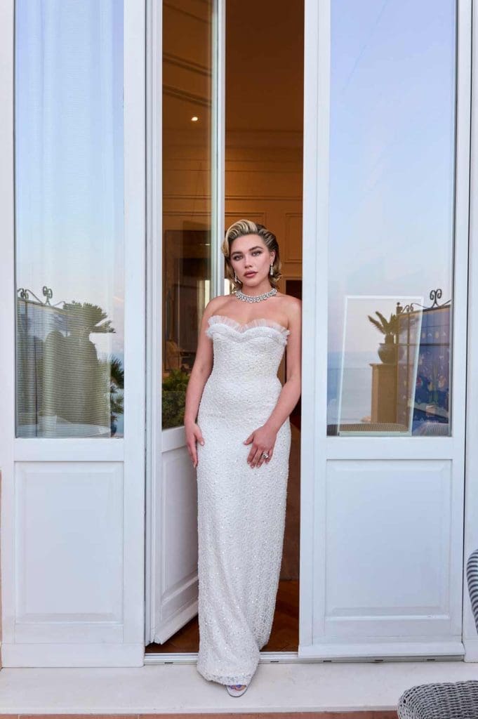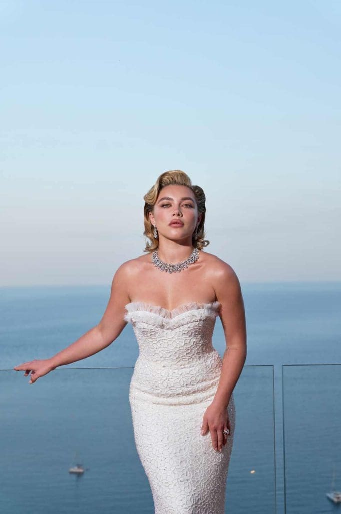 Florence Pugh was seen wearing a white Rodarte Fall 2025 along with a lavish Bvlgari necklace from their new Polychroma collection at their hosted event in Sicily. As for what she thought of her “Sicilian dream”? “I’m grateful for everything, especially the love and of course the Aperols.”