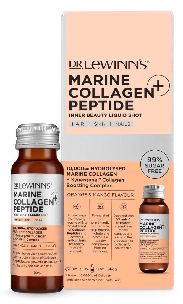 Take your shot of marine collagen, zinc, iron and vitamins A and C on the go with Dr. LeWinn’s Marine Collagen Peptide in Orange & Mango, $59.99.