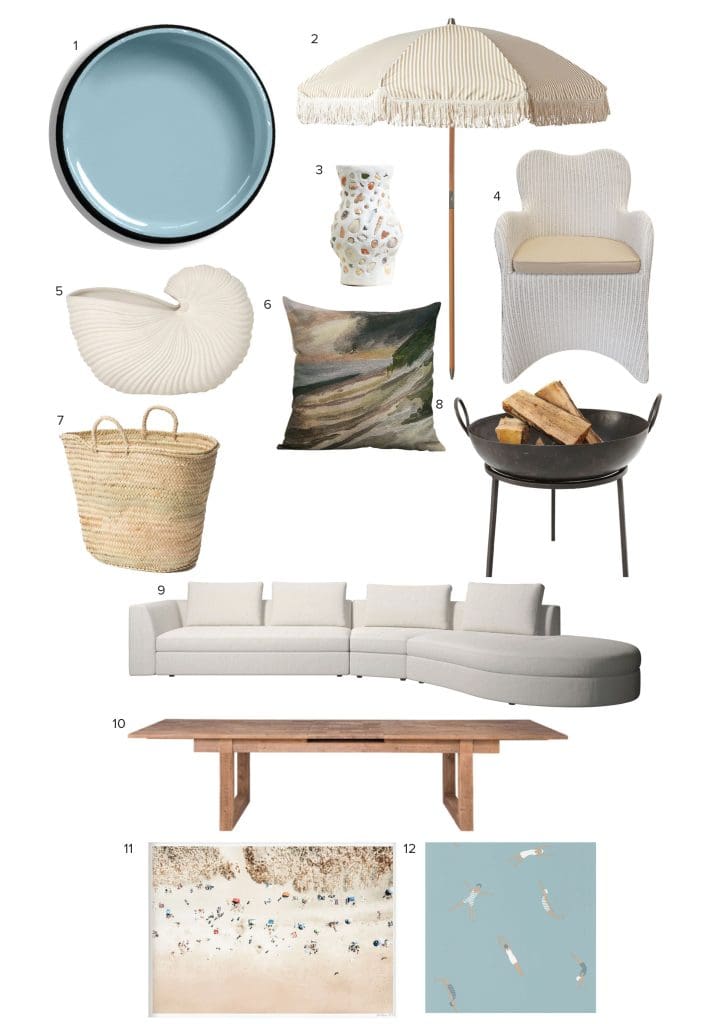1. Resene Escape, $4.90 from Resene ColorShops | 2. Umbrella, $649 from Nest | 3. Vase by Memor Studio, $365 from Bedthreads | 4. Chair, $1608 from Leopold Hall | 5. Pot by Ferm Living, $230 from Slow Store | 6. Cushion Cover, $92.50 from French Country Collections | 7. Basket, $54.90 from Citta | 8. Outdoor Firepit, $699 from Nest | 9. Sofa, $2059 from Bo Concept | 10. Dining Table by Noble Souls, $8959 from Dawson & Co | 11. Print, $690 from Green With Envy | 12. Resene Only Blue Wallpaper Collection from Resene ColorShops