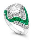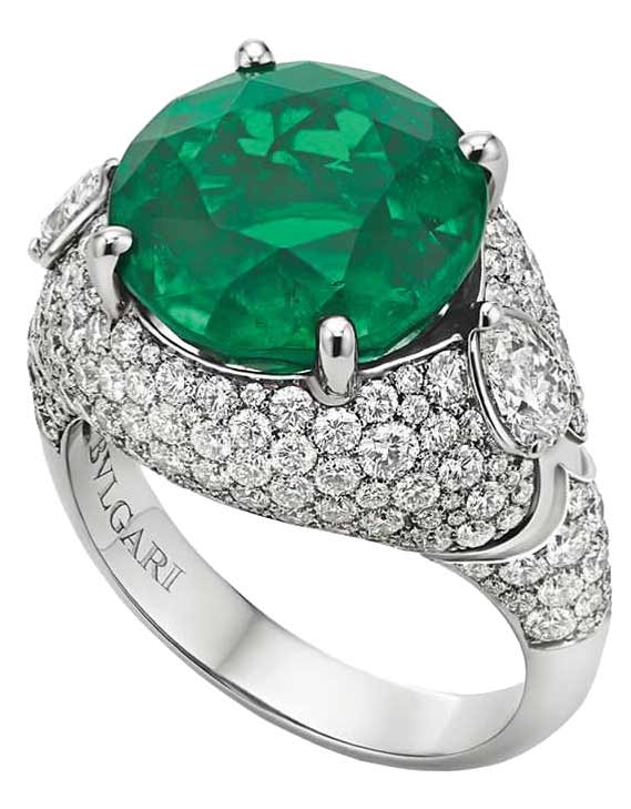 High Jewellery ring in platinum with 1 oval diamond (2,51 ct), 28 buff-top emeralds (2,41 ct), and pavé-set diamonds (1,62 ct)