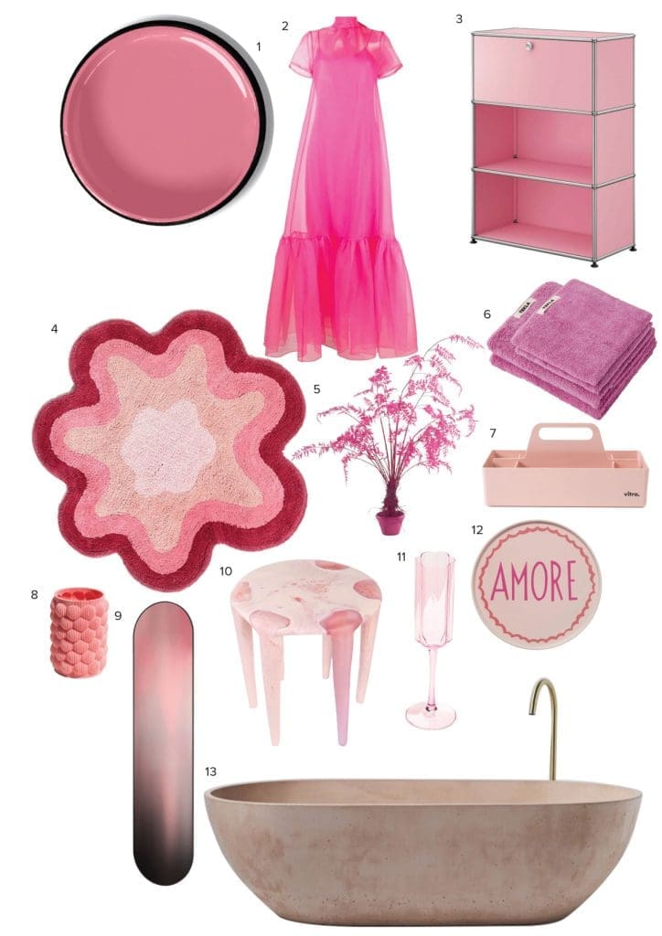 1. Resene Suzie Q, $4.90 from Resene ColorShops | 2. Dress by Staud, $850 from Muse | 3. Shelving Unit by USM Haller, $2838 from Ecc | 4. Bath Mat by Bonnie and Neil, $109 from Superette | 5. Fern by Pols Potten, $1325 from Smith & Caughey’s | 6. Towels by Tekla, from $58 at Simon James | 7. Toolbox by Vitra, $79.99 from Citta | 8. Vase by UAU PROJECT, POA from makersmarkt.com | 9. Mirror by Fritz Hansen, $2215 from Cult | 10. Side Table, POA from Dinosaur Designs | 11. Champagne Flutes by Fazeek, $149 from Moi on George | 12. Plate by In the Roundhouse, $49 from Superette | 13. Bathtub by Concrete Nation, $7599 from Elite Bathroomware