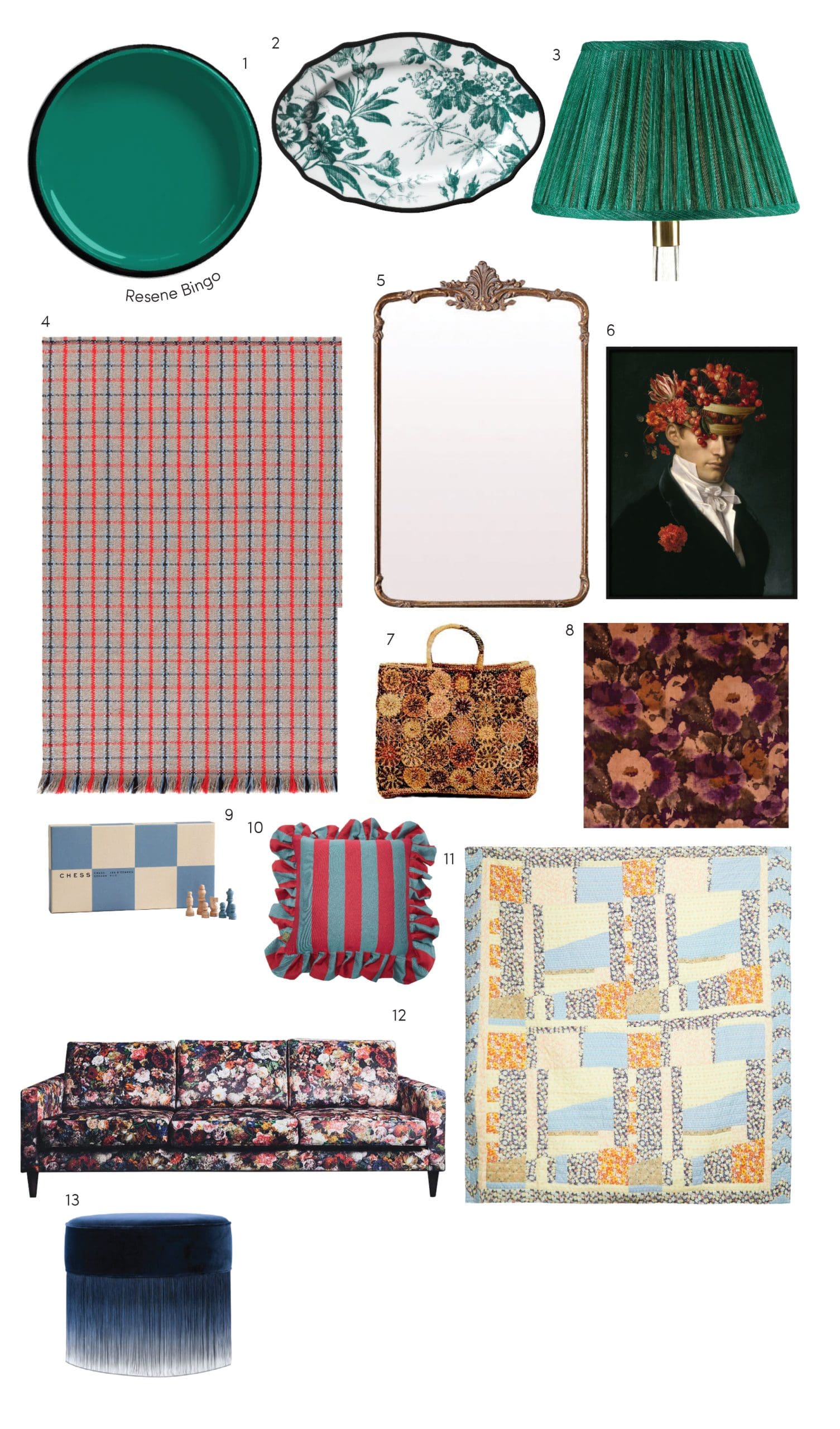 1. Resene Bingo, $4.90 from Resene ColorShops | 2. Tray, $615 from Gucci | 3. Lampshade by Fermoie, $280 from The Ivy House | 4. Rug, $4349 from Dawson & Co. | 5. Mirror, $689 from French Country Collections | 6. Print, $939 from Bianca Lorenne | 7. Bag by Sophie Digard Créations, $750 from Tessuti | 8. Upholstery fabric from the Alchemy Collection, POA from Warwick Fabrics | 9. Chess set, $59.99 from A&C Homestore | 10. Cushion by House of Hackney, $262 from matchesfashion.com | 11. Blanket by Sea, $1155 from matchesfashion.com | 12. Sofa, $3995 from Stacks | 13. Pouf by Moooi, $3595 from Ecc