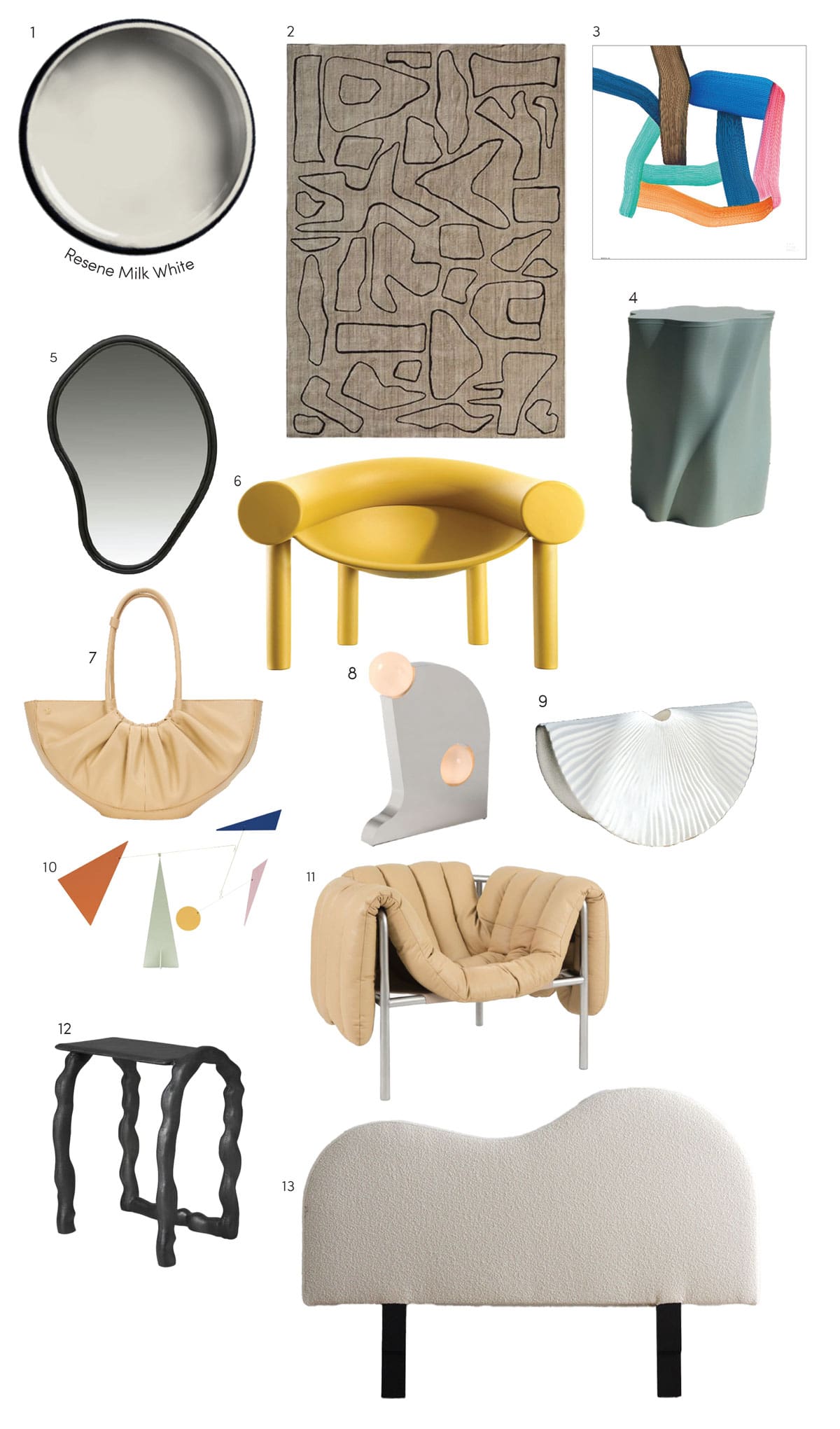 1. Resene Milk White, $5.90 from Resene ColorShops | 2. Rug, $ 3585 from King Living | 3. Poster by Vitra, $119 from Città | 4. Side table by Special Studio, $370 from Naaytu | 5. Mirror, $680 from The Design Library | 6. Chair by Magis, $1190 from Ecc | 7. Handbag, $869 from Deadly Ponies | 8. Sculpture lamp, POA from Snelling | 9. Vase, $89 from ornament.co.nz | 10. Mobile by Volta, $329 from World | 11. Chair, $8925 from Tim Webber Design | 12. Side table by Ferm Living, $1315 from Slow Store | 13. Headboard $1899.99 from A&C Homestore