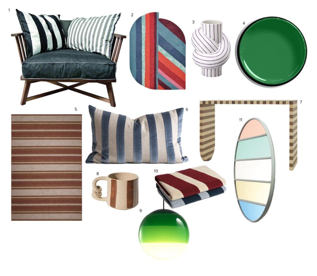 1. Armchair by Gervasoni, $6940 from Ecc | 2. Rug by Ted Baker, $1475 from Bolt of Cloth | 3. Vase by Rosenthal, $149 from Smith & Caughey’s | 4. Resene Wheel of Fortune, $5 from Resene ColorShops | 5. Outdoor rug, $2450 from Ligne Roset | 6. Cushion $179.99 from A&C Homestore | 7. Console by Sarah Ellison, $2950 from Slow Store | 8. Mug $65 from Naaytu | 9. Light pendant by Marset, $935 from Ecc | 10. Pool towels, $260 for pair from Baina | 11. Mirror by Magis, $1288 from Ecc