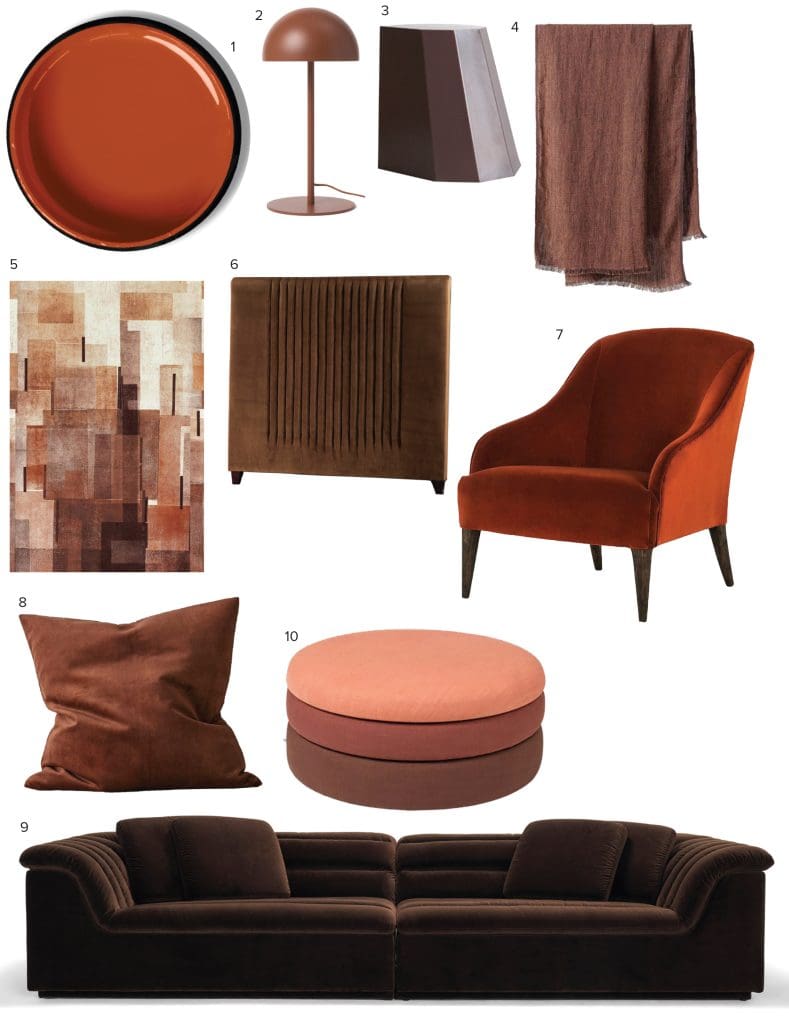 1. Resene Ayers Rock, $5 from Resene ColorShops | 2. Lamp $395 from Citta | 3. Stool by Martino Gramper, $274.99 from A&C Homestore | 4. Throw $249 from Citta | 5. Resene Sensai Wallpaper Collection 296470 from Resene ColorShops | 6. Headboard $1499 from Bianca Lorenne | 7. Armchair $2150 from French Country Collections | 8. Cushion $79 from Weave Home | 9. Sofa by Sarah Ellison, $7800 from Slow Store | 10. Pouf by Broste Copenhagen, $1835 from Smith & Caughey’s
