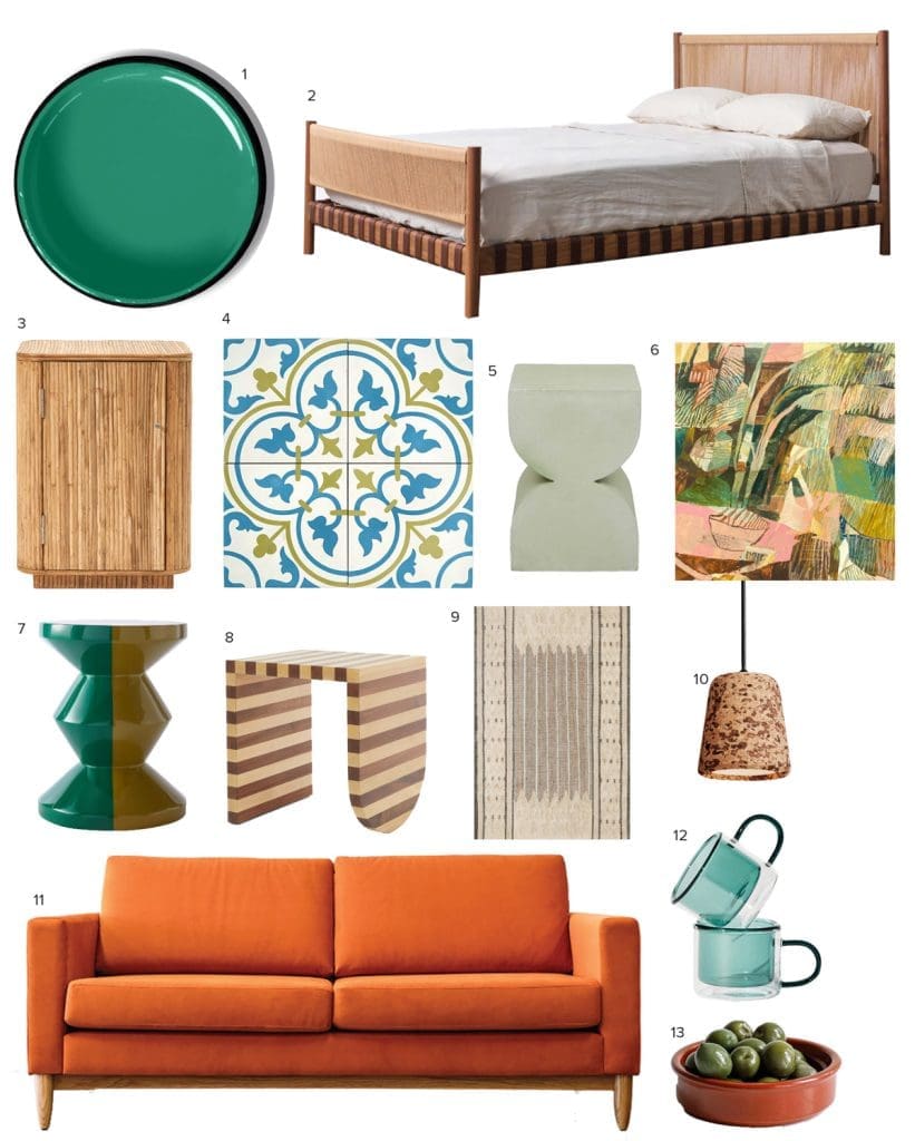 1. Resene Leap Year, $5 from Resene ColorShops | 2. Bed by Napu, POA from Cult | 3. Cabinet, $1795 from Nest | 4. | 5. Stool, $849.99 from A&C Homestore | 6. “Ever Grass” artwork by Megan Grass, $11,187 from Fenton & Fenton | 7. Stool by Pol Potten, $970 from Smith & Caughey’s | 8. Side Table by Sarah Ellison, $1350 from Slow Store | 9. Rug $899 from Green with Envy | 10. Light Pendant by New Works, $310 from Slow Store | 11. Sofa, $3715 from Stacks | 12. Espresso Cups by House of Nunu, $99 from Superette | 13. Tapas Dish, $9.90 from Father Rabbit