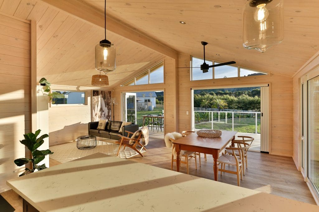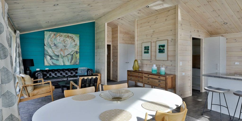 While the neutral exterior colour palette, combined with the home’s interior of warm blonded walls, exudes the airiness of Scandinavian minimalism, a measured pop of colour rooted in nature – “Yowza” by Resene – a touch of depth that feels bold and vibrant as a feature in the living space. The Riverview design also champions low-maintenance living with its exterior aluminium cladding and its blonded wood interiors completely sidestepping the need to paint.