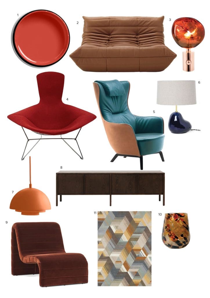 1. Resene Daredevil, $5 from Resene ColorShops | 2. Togo Settee, $12715 from Ligne Roset | 3. Lamp by Tom Dixon, $645 from Ecc | 4. Chair by Knoll, POA from Studio Italia | 5. Armchair by Potrona Frau, POA from Studio Italia | 6. Lamp by Ferm Living, $380 from Slow Store | 7. Pendant lamp by Warm Nordic, $495 from Good Form | 8. Sideboard $3490 from Citta | 9. Armchair $2195 from Coco Republic | 10. Tumbler by Matthew Hall Glass, $85 from Crushes | 11. Rug by Harlequin, $2315 from Allium Interiors