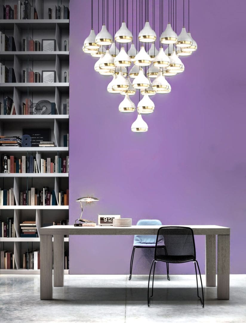 If you are after a home office that’s both stylish and functional take inspiration from this eye-catching setup that strikes just the right balance between bold design and practicality. A vibrant lavender wall instantly livens up the space, while polished concrete floors and a towering bookshelf add a sense of structure and order. Mixing textures—like pairing mismatched chairs—gives the room character without making it feel overdone. And then there’s lighting. It’s the understated champion of any workspace, quietly shaping the mood and boosting productivity.
