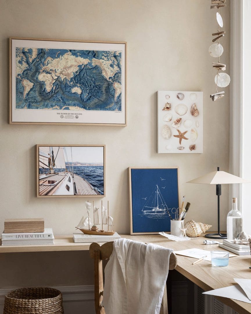 What really brings the space to life is the artwork—pieces from Desenio’s Sea Salt Collection. There’s a mix of nautical themes, from a detailed world map to prints of seashells and sailboats, all working together to create a peaceful, beach-inspired vibe. I especially love how the frames are placed at slightly different heights; it feels casual but intentional, not too staged.