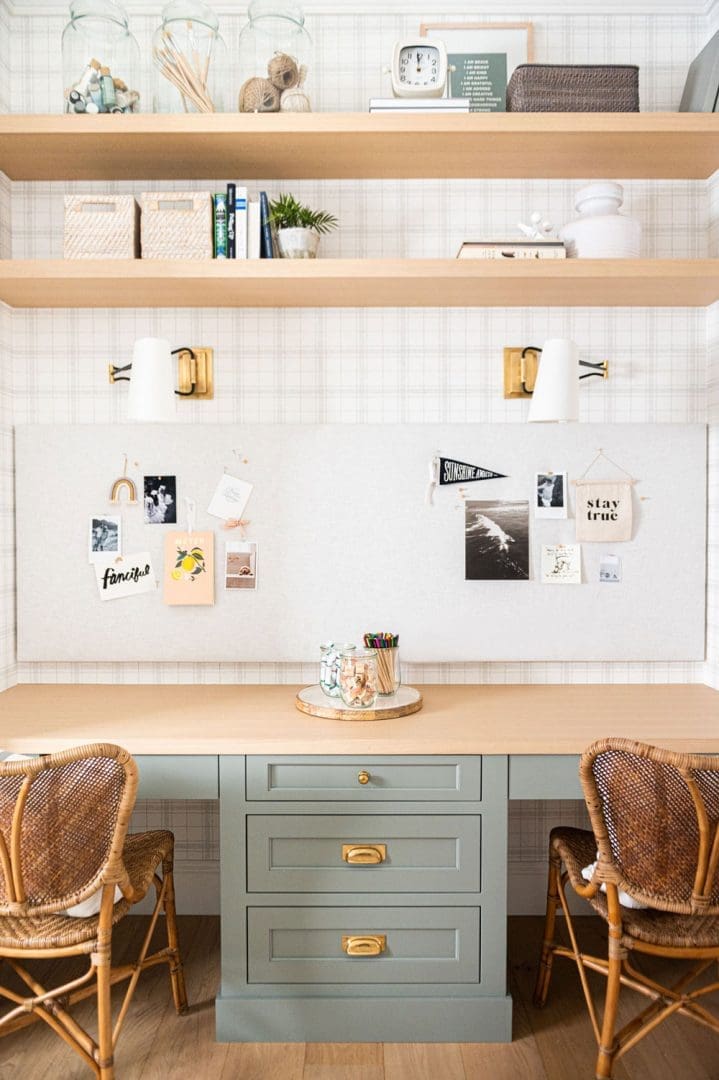 A simple pinboard on the wall makes it easy to stay organized or display favorite memories, whether it’s a photo, an inspiration, or just a list of to-dos. To top it all off, wall-mounted lamps provide focused light right where you need it, freeing up space on the desk for work.