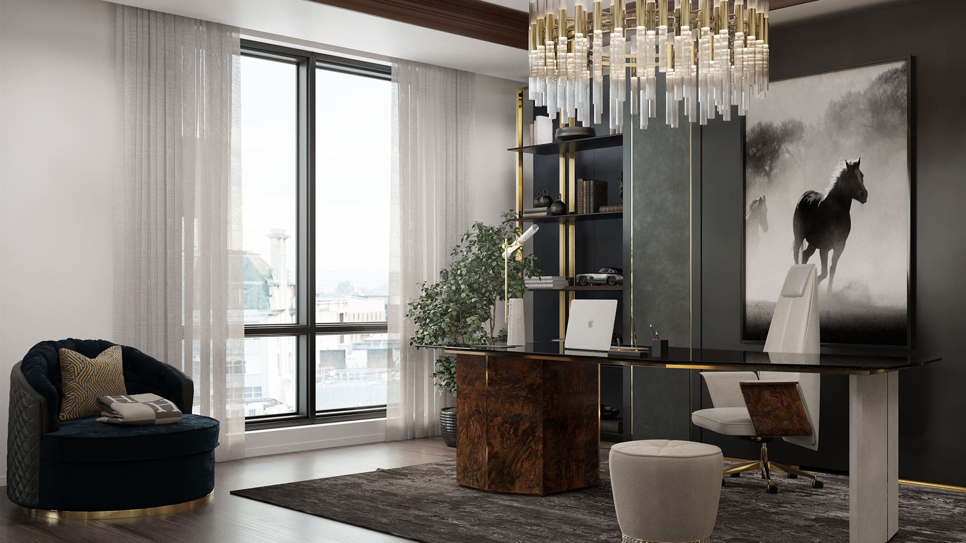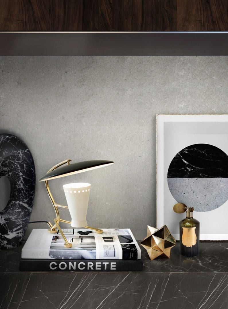 Creating a home office that blends style and substance begins with layering textures, materials, and accents in a thoughtful way. Take, for example, the striking combination of bold, tactile elements like marble and concrete, softened by reflective surfaces and warm details. Mixing black marble with muted greys and metallic gold accents creates a space that feels sophisticated yet grounded. Adding small sculptural pieces and carefully chosen artwork adds personality without making the room feel cluttered.