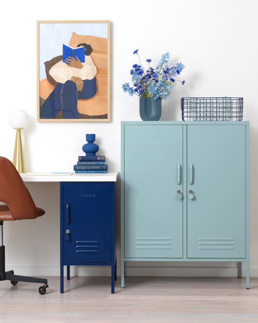 Who says a home office has to be dull? This setup by Mustard Made adds a playful burst of colour, featuring the Shorty locker in Navy and the Midi locker in Ocean. It’s a clever combination of practicality and style that makes staying organised far more enjoyable.