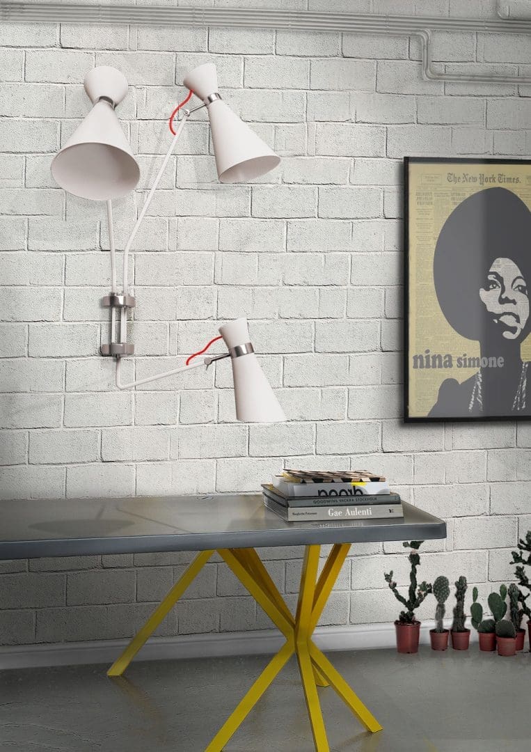 This workspace beautifully highlights the Simone Wall light by DelightFULL, combining practicality with a touch of artistry. Its asymmetrical design, oversized lampshades, and bold red textile wiring offer a fresh, contemporary spin on a timeless classic. The handmade brass structure paired with white aluminium shades perfectly complements the minimalist white brick wall, giving the space both personality and charm.