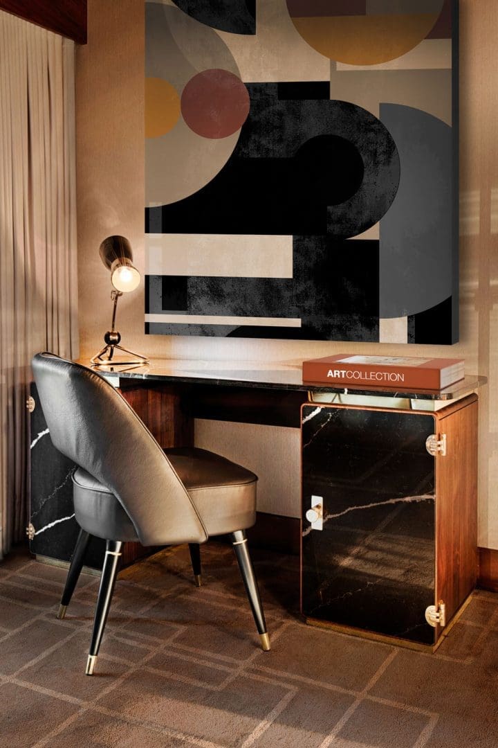 Designing a home office that feels both sophisticated and comfortable is all about striking the right balance between timeless design and modern touches. In this setup, rich materials like dark marble, warm wood, and sleek brass accents come together to create a workspace that is not only functional but effortlessly elegant. The geometric wall art above the desk adds depth and character, tying in beautifully with the mid-century modern aesthetic.
