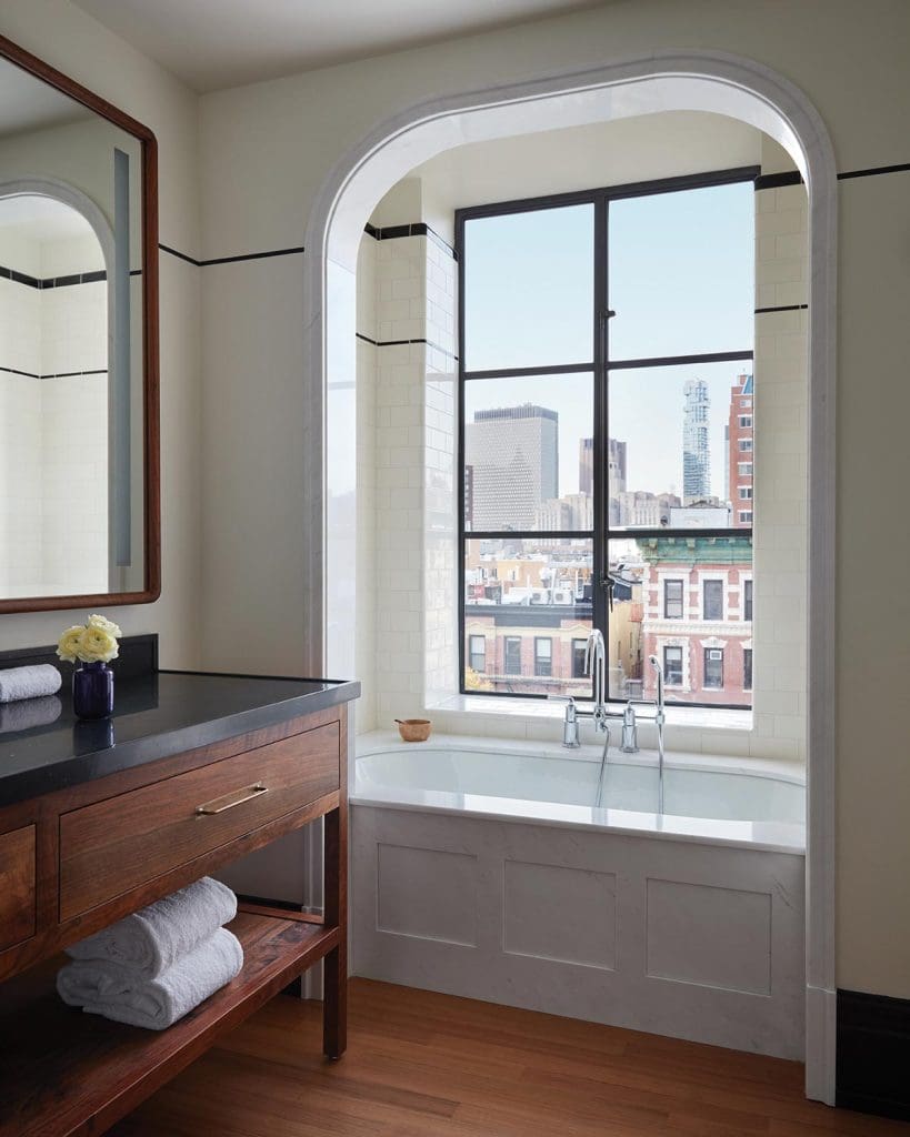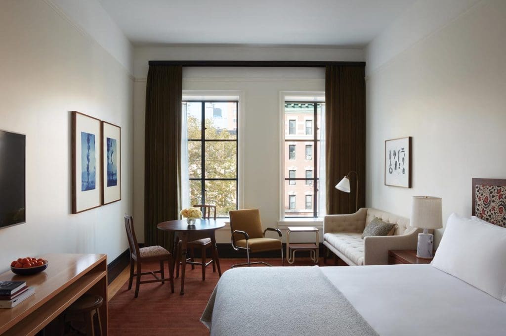 As ornate as the façade and the public spaces might be, the rooms opt for something a little more subdued. The interiors exude warmth and charm, seamlessly blending bygone elegance with contemporary comforts. Every detail, from the painted room numbers to the cosy chairs and simple tables, evokes the essence of the New York apartment—elegant and inviting, with a touch of nostalgia. Think subdued materials of the highest quality, custom fixtures, restored moldings, and large windows that showcase generous vistas of the city and the vibrant surrounding neighbourhood.