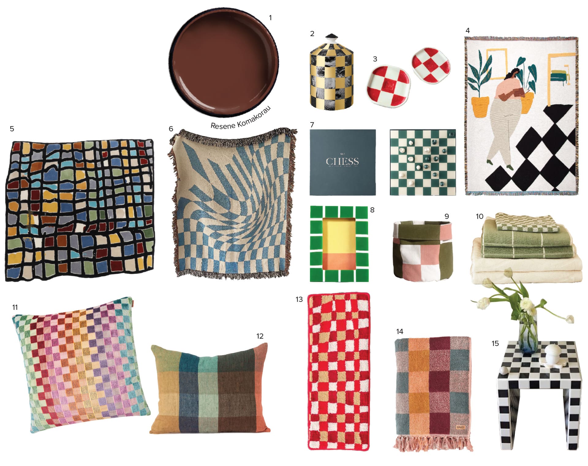 1. Resene Komakorau, $4.90 from Resene ColorShops | 2. Candle by Fornasetti, $357 from Mecca | 3. Dish, $40 from samyoungart.com | 4. Throw POA form slowdownstudio.com | 5. Rug by Dilana, POA from Good Form | 6. Blanket, POA from clrclr.com | 7. Chess set by Printworks, $89 from collected.co.nz | 8. Photo frame by &K, $49 from Ruby | 9. Planter $60 from laurenbrown.online | 10. Towel set $390 from Baina | 11. Cushion by Missoni, $275 from matchesfashion.com | 12. Cushion $84.90 from Città | 13. Rug, $250 from aliceduncangardiner.com | 14. Bath towel by Kip&Co, $69 from Moi on George | 15. Table $750 from Naaytu