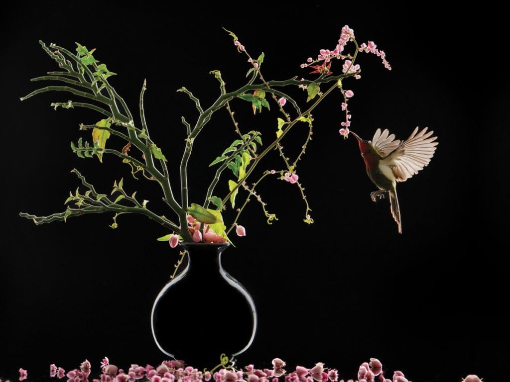 The image is a conceptual photo which shows a gorgeous sunbird flying towards a vase full of flowers.
