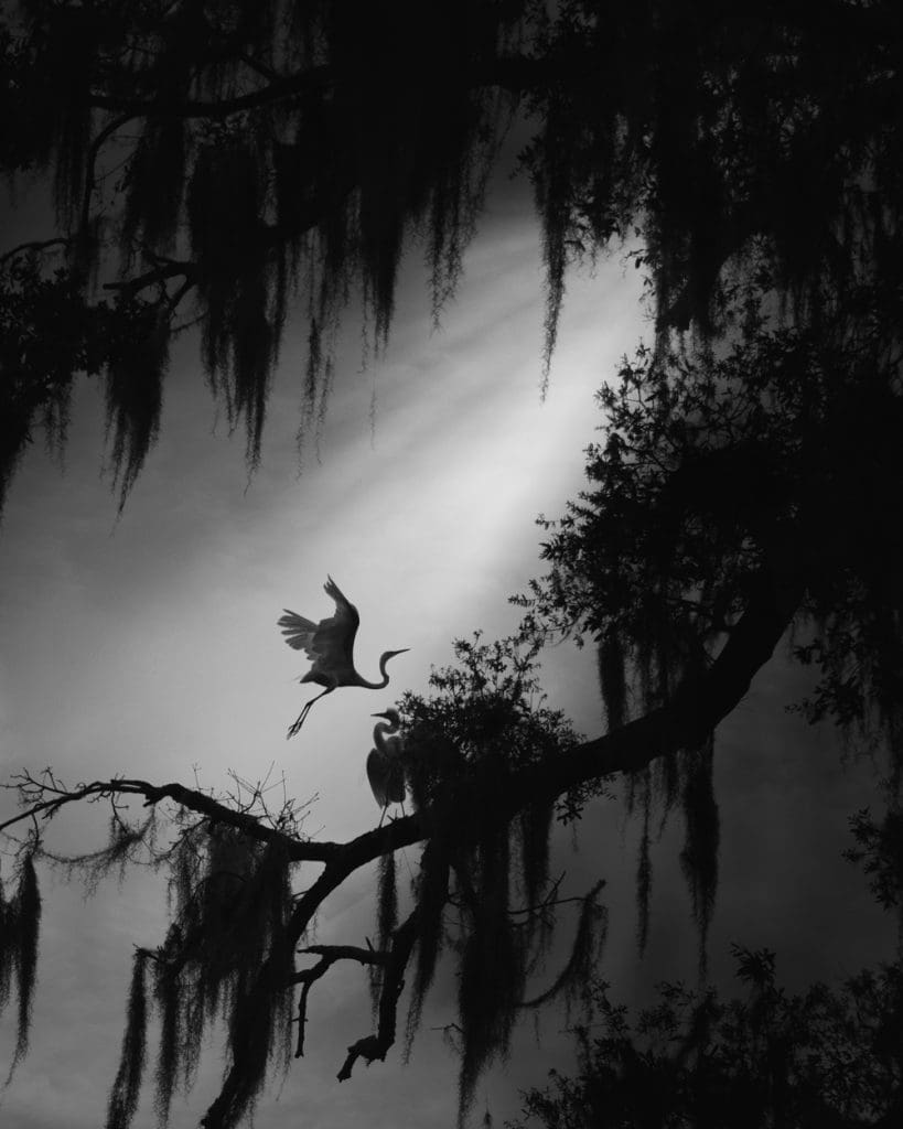 Image Description: One day in the Spring of 2020, I was lucky to have captured the Great Egret and the oak tree before the city removed the tree due to its unhealthy condition. The oak branches and hanging Spanish moss framed the egret while I waited for it to take off. Finally, I was able to capture this exquisite moment.