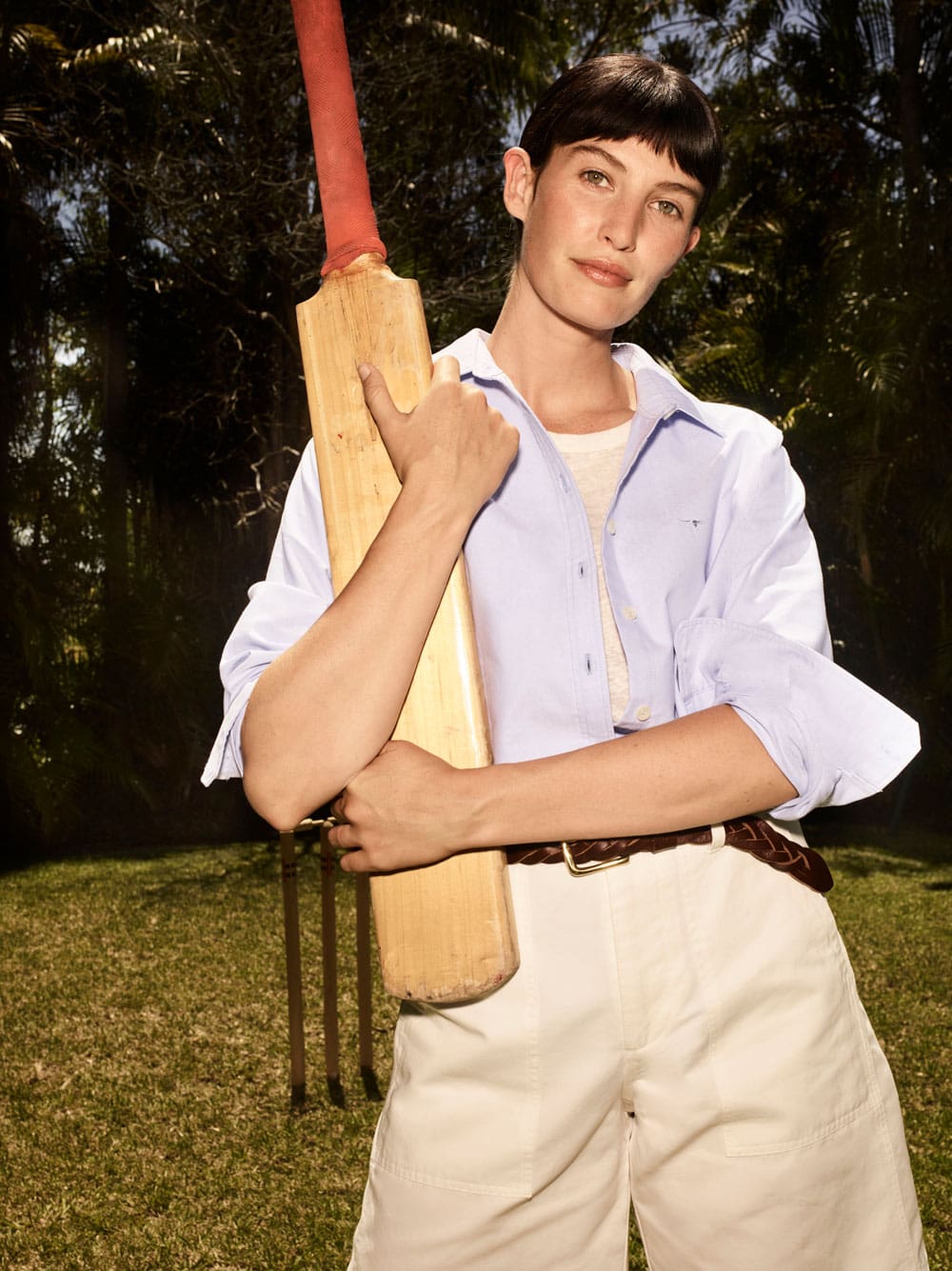 Olney shirt light blue RRP $219.00, Heritage linen tee ivory RRP $109.00, Camp short wood ash RRP $199.00, Stockmans plaited leather belt dark tan RRP $189.00