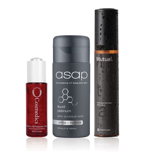 Reinforcing skin barrier function is crucial while we have our heat setting on high. Boost your skin’s immunity with O Cosmedics B3 Plus, $152, a skin tone and collagen boosting serum with 12% niacinamide to improve texture and radiance. asap Liquid Platinum, $85, works overnight to decrease melanin concentration and effectively brighten and hydrate the skin. For an all-in-one approach, Mutual uses an AI algorithm to curate a customised formula that targets all of your skin concerns, $174.
