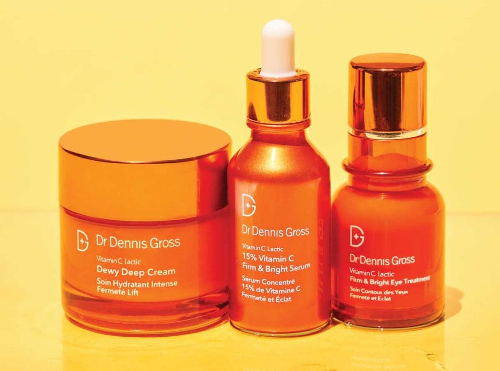 Dr Dennis Gross 15% Vitamin C Firm & Bright Serum, $145; Firm & Bright Eye Treatment, $116; Dewy Deep Cream, $128.