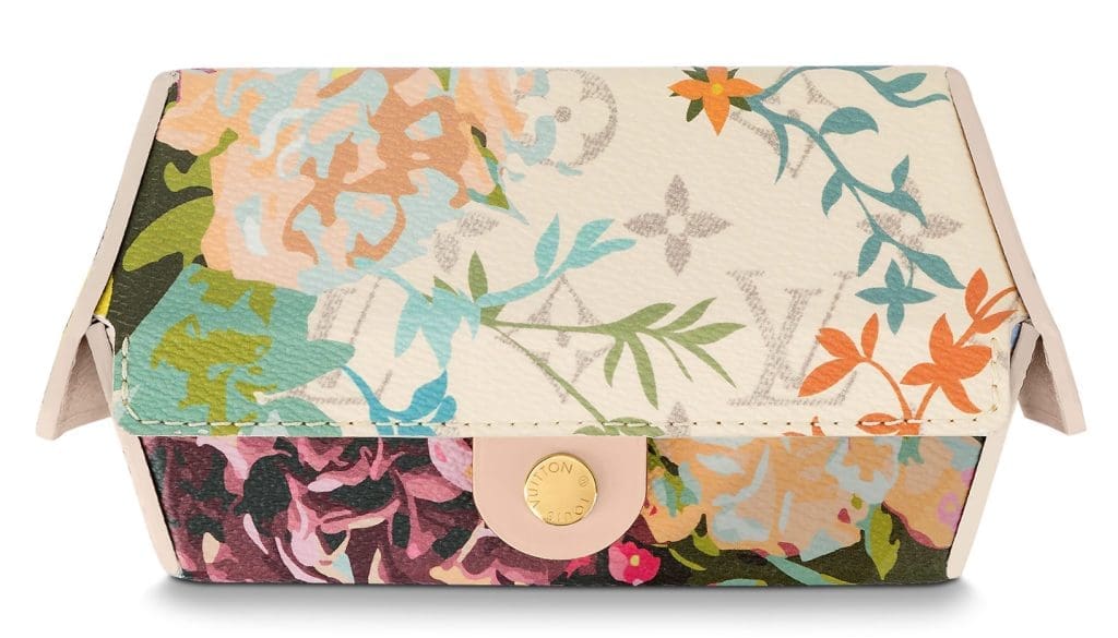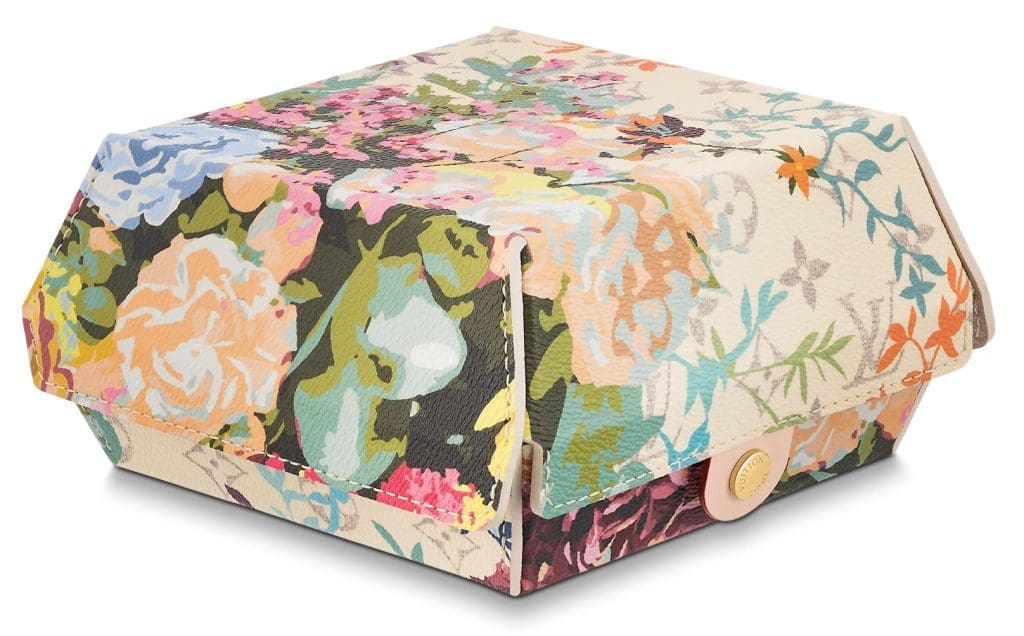 The LV Flower Burger Box is part of a larger collection taking inspiration from fast food. LV has also adapted a leather popcorn container using the same leather pattern as well as keep cups with matching cozies.