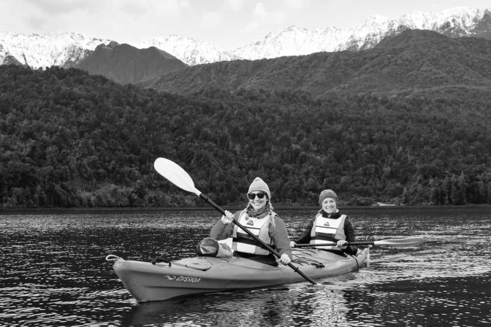 A mere 10-minute drive from Franz Josef is Lake Mapourika. It’s completely calm without a breath of wind as we clambered into our 2-person kayaks. The backdrop of the lush bush and the rugged Southern Alps is so ridiculously stunning it caused us to stop frequently as we paddled out to marvel at the sheer magnificence of what was before us.